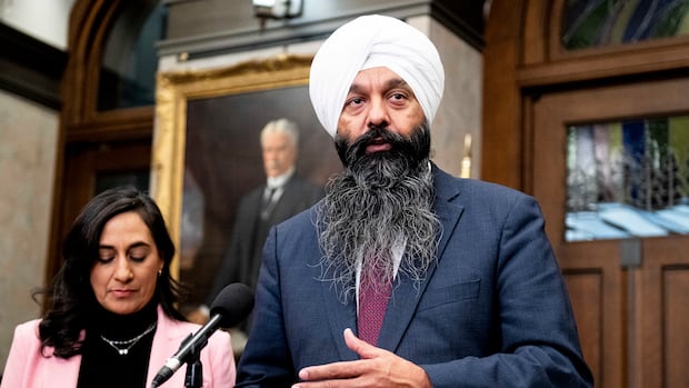 Randeep Sarai, parliamentary secretary for international development, standing alongside Minister of Foreign Affairs Anita Anand, announced $7 million in relief funds for islands hit by Hurricane Melissa. ‘We’re standing with the Caribbean today,’ he said.