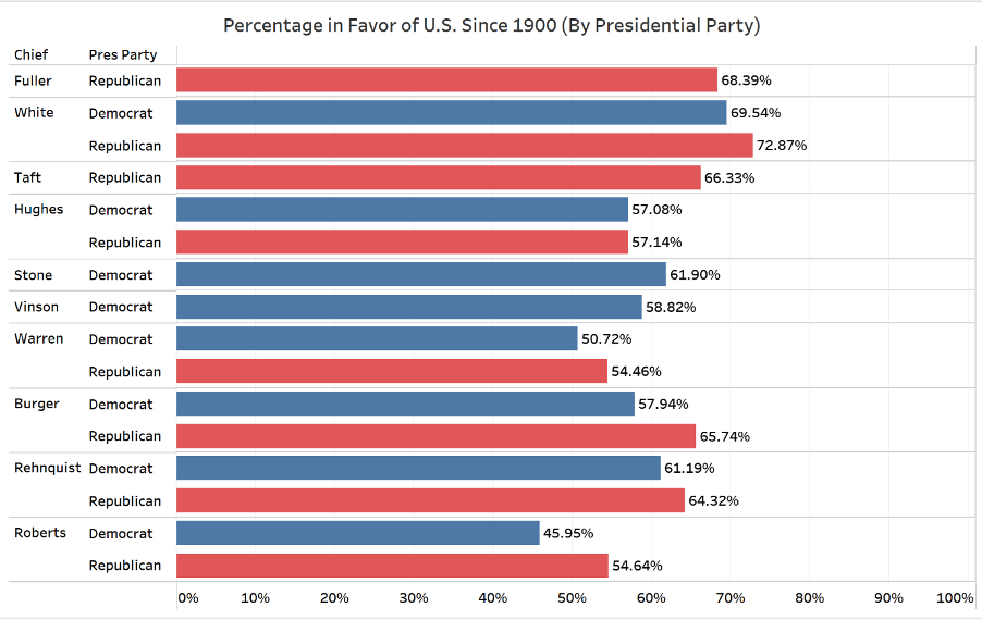 The next chart breaks down support for the United States by chief justice and the party of the appointing president. The analysis is limited to chief justices since 1900 in order to focus on the modern era of more developed executive power.