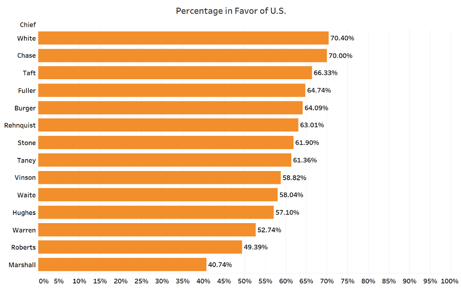 Finally is the court under Chief Justice John Marshall (1801-1835). Given Marshall was generally considered a proponent of federal power, it is of some surprise that his court shows a historically low 40.74% support rate for the United States. That said, this may reflect the limited scope of federal authority in the early republic and the nascent state of executive power during that era more than anything else.