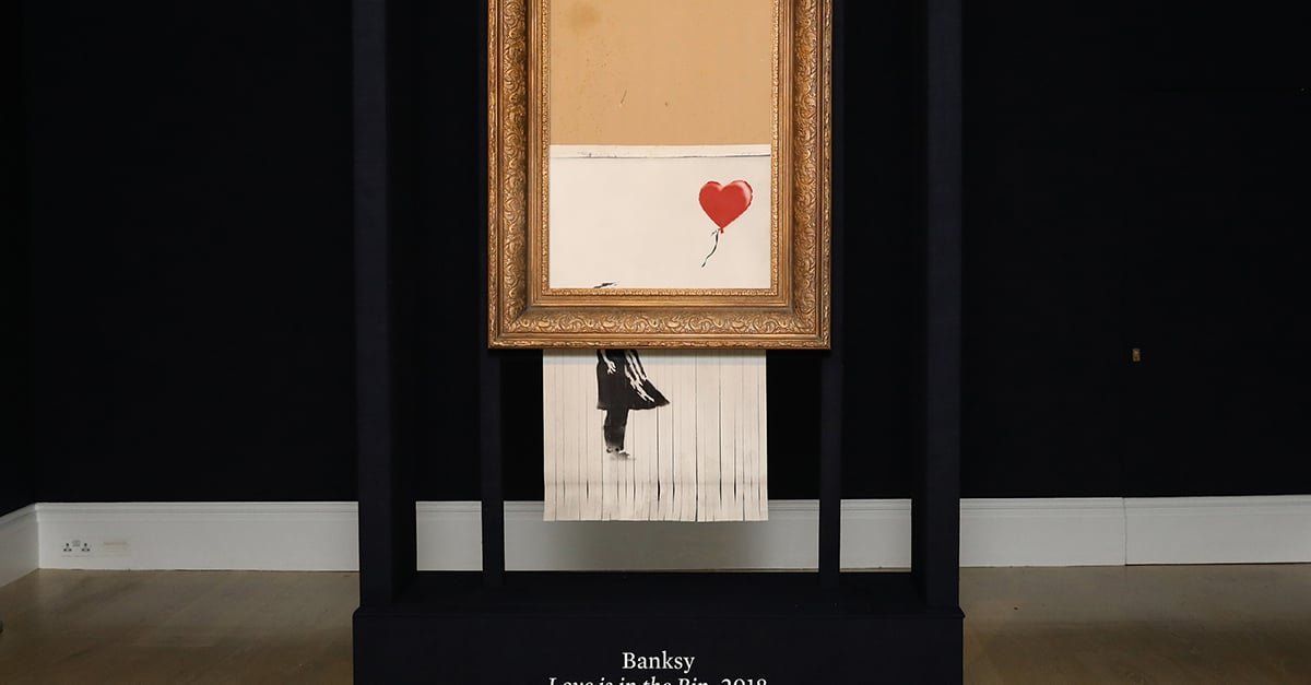 The artwork, as seen from the above video, was intended to be shredded the entire way through, therefore leading to the name Love Is in the Bin – but a malfunction caused it to be shredded only halfway through.